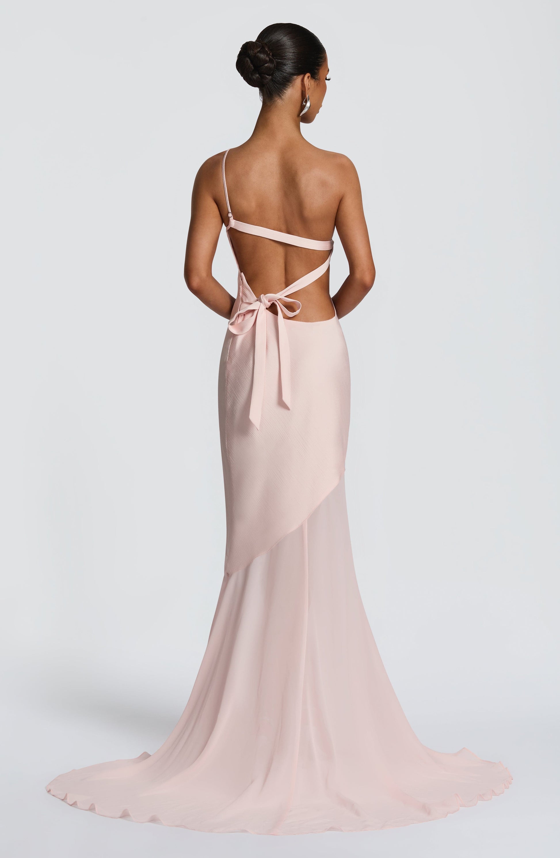 The Fable Gown in blush features a textured satin bodice with a semi-sheer chiffon skirt in a graceful bias cut. Its asymmetric one-shoulder neckline and open back, accented by a cross back strap tied at the hip, enhance its elegant silhouette. The fishtail skirt flares into a delicate train, perfect for refined occasions.